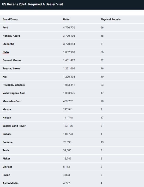 与之形成鲜明对比的是,福特(包括其豪华品牌林肯)虽然不再是召回总量的领跑者,但在“最不便召回”方面仍然稳居榜首。2024年,福特的实体召回量高达480万辆,意味着几乎所有的召回都需要车主将车辆送至维修店,给消费者和经销商带来了不小的压力。尽管福特失去了总召回数量的“冠军”位置,但在需要实体维修的召回数量上,仍未被其他厂商超越。