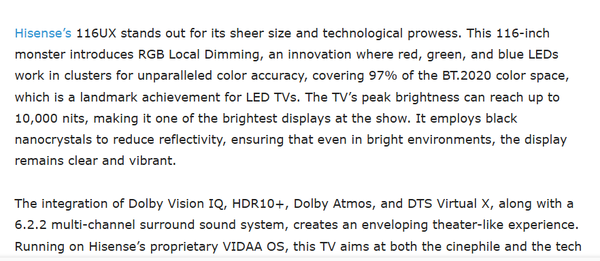 外媒评选CES 2025最佳电视产品:海信116UX上榜