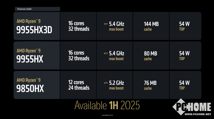 此外还有同为16核心32线程、最高频率5.4GHz的锐龙9 9955HX,总缓存容量80MB。还有配备12核心24线程的锐龙9 9850HX,最高频率5.2GHz,总缓存容量76MB。锐龙9000HX处理器的标准TDP均为54W,并且搭配RDNA 2架构亮机核显。该系列处理器预计将在2025年上半年与多个合作伙伴的笔记本产品一起上市。