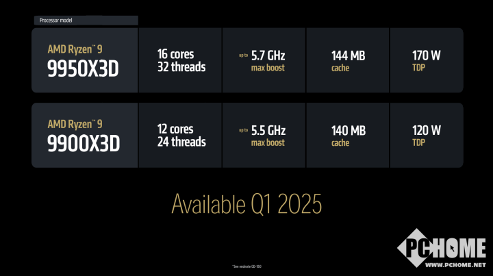 与锐龙7000X3D系列一样,锐龙9 9950X3D和锐龙9 9900X3D依旧仅有单CCD配备了3D V-Cache,另一个则依旧是普通的Zen 5 CCD,所以这两颗处理器的L3缓存都是96MB+32MB。锐龙9 9950X3D是16核32线程,最高频率5.7GHz,L2+L3缓存容量144MB,TDP为170W。而锐龙9 9900X3D则是12核24线程,最高频率5.5GHz,L2+L3缓存容量140MB,TDP为120W。