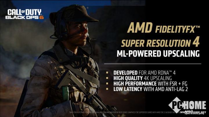 AMD还宣布为RDNA 4架构带来FidelityFX Super Resolution 4(FSR 4),暂时还不确定是否能用于旧款显卡。这是完全AI驱动的超分辨率技术,引入了一个新的基于机器学习(ML)的放大组件来进行处理,与帧生成及更新的Anti-Lag 2配对,构成FSR 4功能集。AMD已确定,《使命召唤21:黑色行动6(Call of Duty: Black Ops 6)》是首批支持FSR 4的游戏之一。