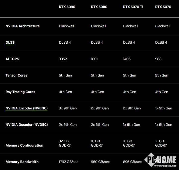 全新的NVIDIA Blackwell架构配备第五代Tensor Core,借助FP4和DLSS 4,提供强劲AI性能。采用新型SM多单元流处理器,针对神经网络着色器优化。配备第四代RT Core,专为Mega Geometry技术打造。