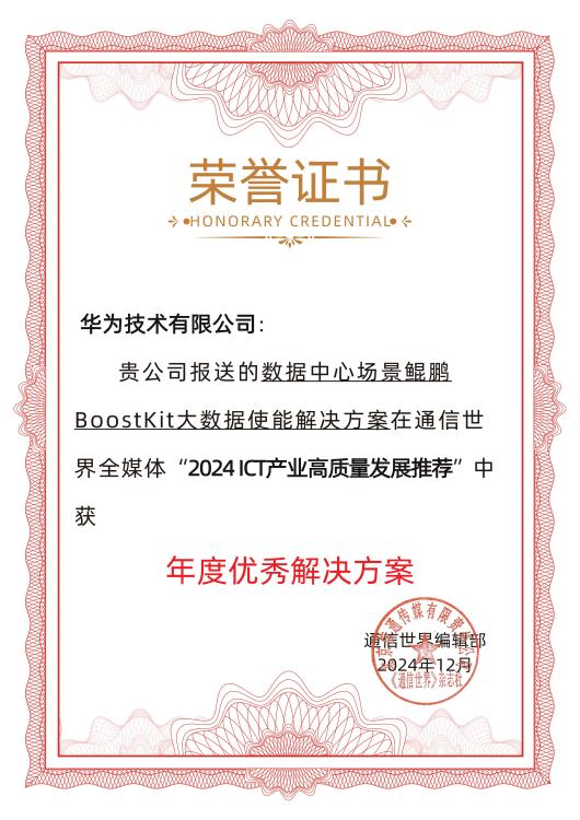 近日,“2024ICT产业高质量发展推荐”在2025ICT行业趋势年会正式发布。“数据中心场景鲲鹏BoostKit大数据使能解决方案”入选“2024年度优秀解决方案”。