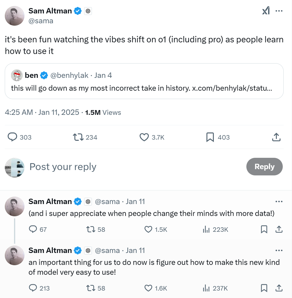 对于作者态度的转变,奥特曼很是欣慰,表示道:「随着人们学会如何使用 o1(包括 pro 版),观察人们对它态度的转变真是很有趣。」