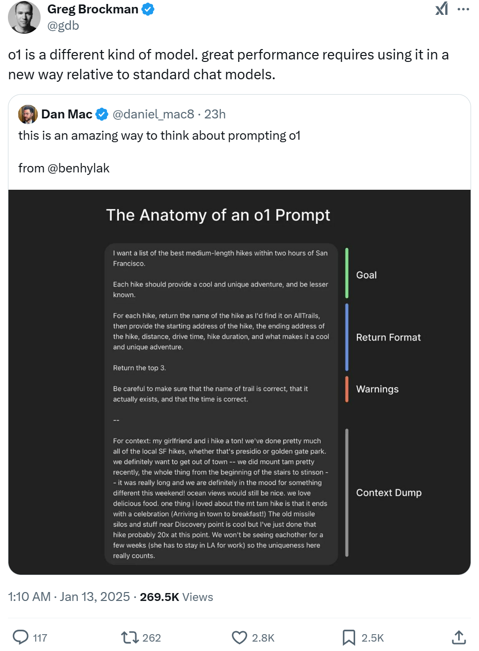 这与使用 o1 取得成功的方法完全相反。不要告诉它如何做 —— 只告诉它做什么。然后让 o1 接管,自行规划和解决问题的步骤。这就是自主推理的作用所在,实际上这比你作为人工环节手动审查和聊天要快得多。