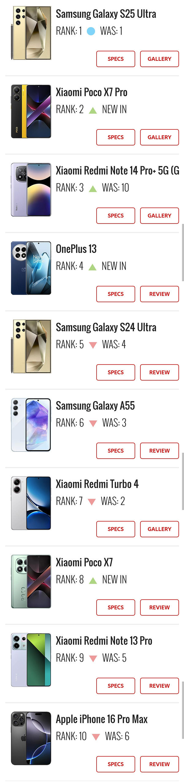 排名榜首的依旧是备受期待的三星S25 Ultra,这款手机将在不到两周后正式发布,成为今年首个引发热议的旗舰手机。紧随其后的是小米POCO X7 Pro和刚刚在全球发布的REDMI Note 14 Pro+,这两款手机凭借其高性价比和强大功能迅速吸引了大量消费者的关注,排名位居第二和第三。