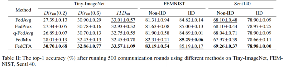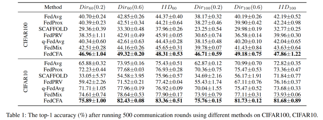 实验采用两个指标:500 轮后的全局模型精度 和 达到目标精度所需的通信轮数,来评估 FedCFA 的性能。