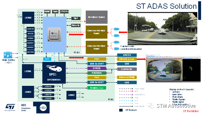 本DEMO是采用单目前视智能相机,后续可扩展至轻量级行泊一体、智能座舱的DMS/OMS等应用场景。本DEMO基于ST自有产品线,如MCU、SBC、PMIC以及LDO等芯片,并与Horizon及Lierda合作,联合开发这款ADAS域控解决方案。其主要特点如下: