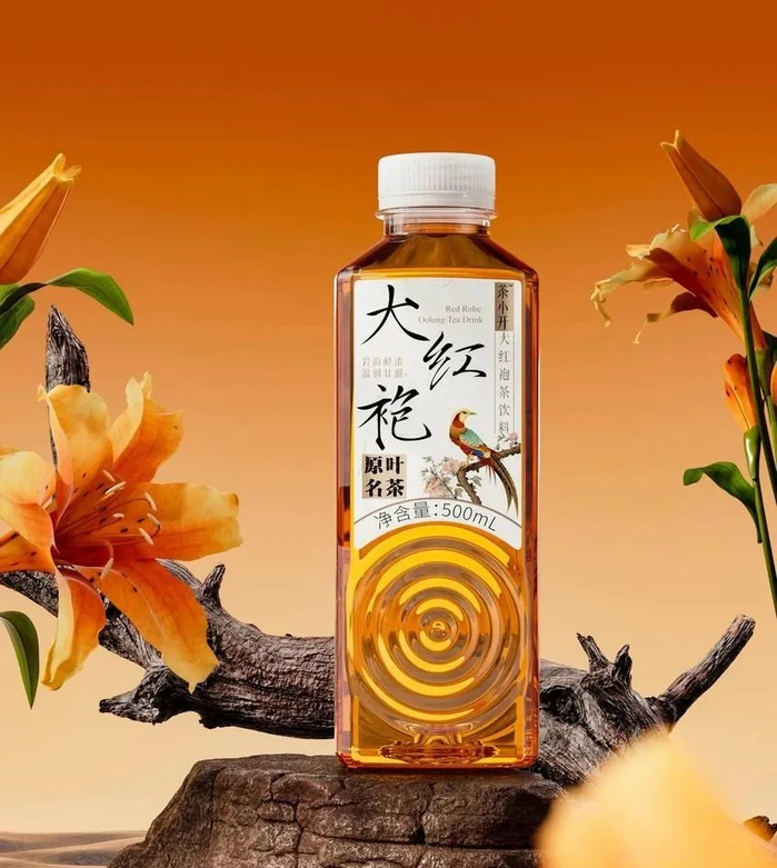 据介绍,为了在消费者心智中形成“具有东方美感、文化、价值观”的茶饮料品牌形象,茶小开瓶身包装上的口味名称字体采用宋徽宗的瘦金体,并将字号放大;同时背景会结合宋代名画,整体设计突出东方美感。瓶型的设计上,茶小开为了呈现“茶水滴入茶杯而荡起圈圈涟漪”的画面,创新设计了“波纹瓶”造型,并命名为波光流体瓶。