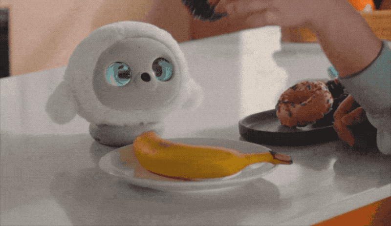 比如它会表示饥饿,并发出肚子咕噜咕噜的声响,当人类像逗宠物一样将食物放在它面前时,它会借助摄像头和 AI 记住事物的样子,当再次看见同样的食物以后,它会在眼球上显示食物的图标,并发出咀嚼的声音。