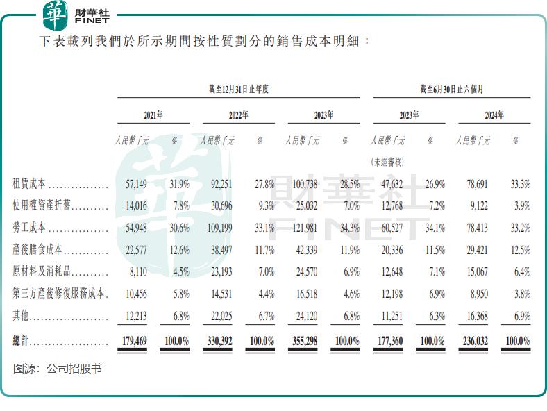 圣贝拉的月子中心大部分设于高档酒店,少数设于独栋别墅,因此需支付租赁成本,公司2023年的租赁成本就达到1亿元。此外,公司劳工成本亦较高,2023年达到了1.22亿元。在2023年,该两项成本合计占公司销售成本超过62%。