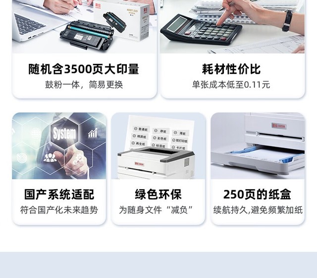 (中关村在线 四川行情)震旦AD319PDN是一款4A幅面黑白激光打印机,输出速度高达31页/分钟,首页输出时间低于8.5秒,支持自动双面打印,1200*1200dpi高清输出,250页大纸盒,还有贴心的一键身份证复印,团队共享打印,绿色环保,适配国产系统,安全可控。