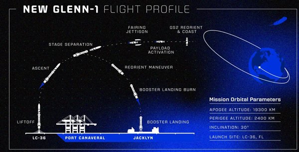 根据计划,“新格伦”火箭的首飞并不复杂。在一级助推器点燃底部7个BE-4发动机几分钟后,助推器将与火箭的上半部分分离。后者将携带试验载重加速至进入轨道所需的速度——每小时1.75万英里,但不会在轨道上部署卫星。