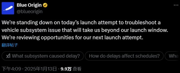蓝色起源公司宣布,由于需要排查一个火箭子系统的问题,导致错过周一的发射窗口,将会审查下一次尝试发射的机会。