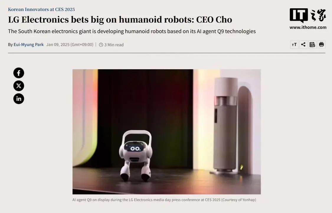 LG 电子首席执行官赵周完在 CES 2025 展会期间的新闻发布会上表示:“机器人无疑是未来人类的关键,(LG 电子)正在开发面向家庭的人形机器人,站在机器人研发的前沿。”