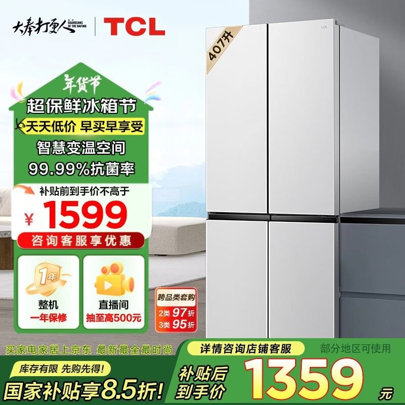 TCL 407升十字对开门冰箱,活动价仅需1243元!