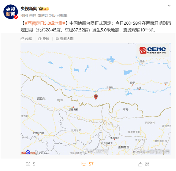 快科技1月13日消息,据央视新闻报道,中国地震台网正式测定:今日20时58分在西藏日喀则市定日县(北纬28.45度,东经87.52度)发生5.0级地震,震源深度10千米。