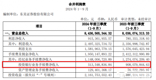除此之外,通过东吴证券发布的2024年第三季度报告显示,在2024年前三季度公司投资银行业务手续费净收入约为5.14亿元,相较于上年同期的9.08亿元,降幅高达43.39%。