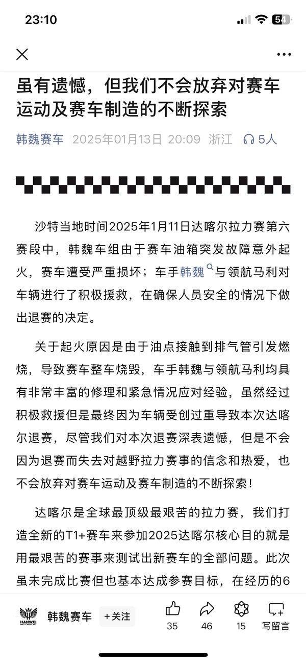 而韩魏赛车公众号公布了退赛的详细缘由。