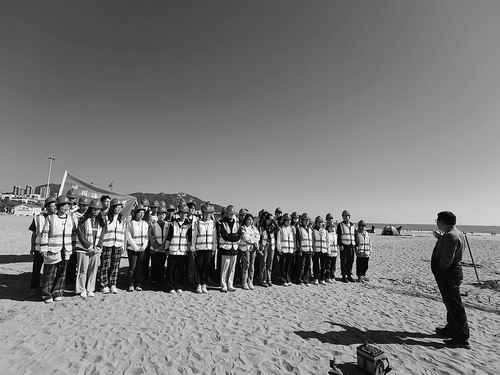 ① 师生在青岛石老人海滩开展“沙滩寻宝”实践教学。