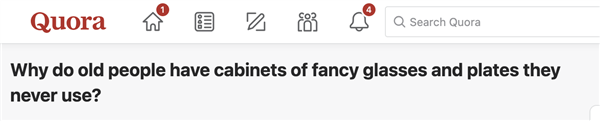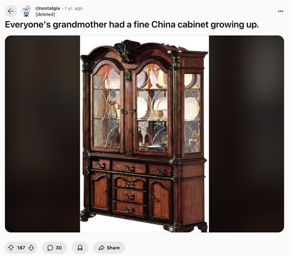 在reddit上名为“Why do old people have cabinets of fancy glasses and plates they never use?”的帖子里