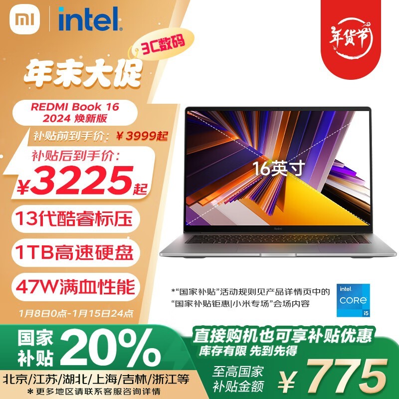 红米笔记本电脑13代酷睿i5标压版优惠活动价3183元,国家补贴高达20%!