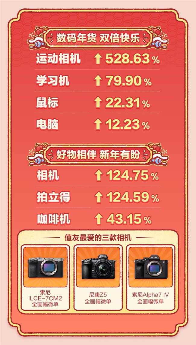 与此同时,一些更为“小资”的单品被列入消费者年货必备清单。年货节期间,相机、拍立得、咖啡机GMV分别同比增长124.75%、124.59%和43.15%,售价过万、号称“性价比最高的全画幅索尼E卡口微单”的Sony Alpha 7C II全画幅相机位居平台相机品类GMV TOP1,以大疆和GoPro为代表的运动相机GMV更是同比增长528.63%。“相机具有更强烈的出片风格,能够满足年轻人社交和分享需求,而且很多相机保值效果特别好,号称电子茅台。”张宇昂指出,相机如今已成为年轻人新的社交货币,更是某个兴趣圈层的入场券。
