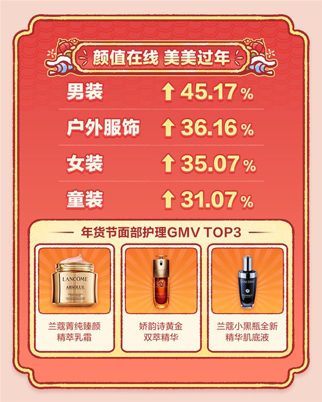 置新衣,换新颜,于消费者而言不仅是为过去一年画上圆满句点,也传递了对新一年美好生活的祝愿。年货节期间,什么值得买平台内男装、户外服饰、女装和童装GMV分别同比增长45.17%、36.16%、35.07%和31.07%。消费者年货购置热情高涨,高端面部护理产品也受到抢购,兰蔻菁纯臻颜精粹乳霜、娇韵诗黄金双萃精华和兰蔻小黑瓶包揽面部护理品类GMV前三。