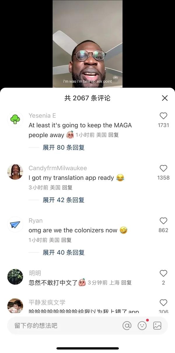 还有一位大哥的评论区聚集了很多美国人,中国人说忽然不敢打中文了,还有人说以为自己上错了App。