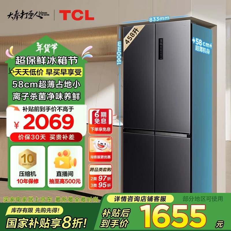 TCL R458T5-U超薄一级能效双变频节能风冷无霜冰箱1517元