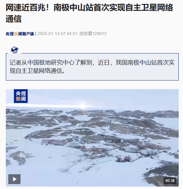 央视刚刚援引中国极地研究中心的消息称,我国南极中山站近日首次实现自主卫星网络通信。网速从 8 兆升级到近 100 兆,相当于由 2G 网速提速到 4G 网速。