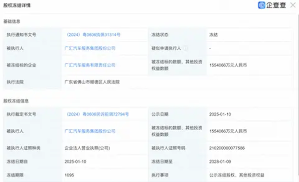 信息显示,此次涉及股权数额达155亿余元,冻结期限自2025年1月10日至2028年1月9日,为期1095天。