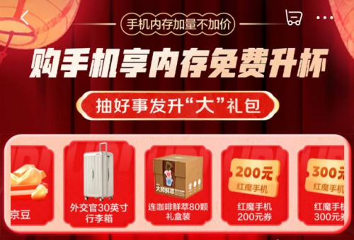 想要入手新手机的消费者锁定京东年货节,到京东APP搜索“手机内存升杯”即可进入页面抢购新机,花小内存的钱,得大内存手机。