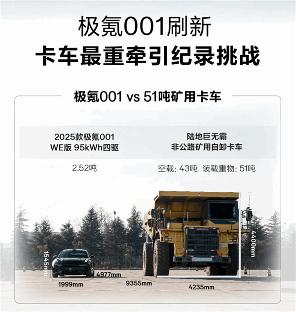 据介绍,此次卡车最重牵引纪录挑战,是在-3℃的低温环境下,由极氪001 VS 51吨重的矿用卡车。其中,2025款极氪001 WE版 95kWh四驱车型,车重2.52吨;非公路矿用卡车空载42吨,货斗内加装8吨挖掘机后,总重51吨。