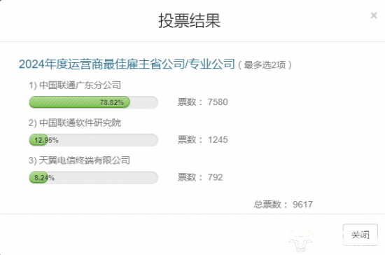 根据投票结果,截止1月14日上午9时,“2024年度运营商最 佳雇主省公司/专业公司”奖项上榜的有三家企业。其中,广东联通已较高的票数位列榜首。