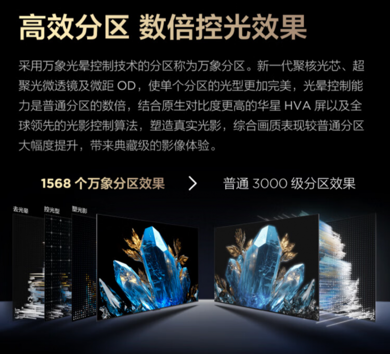 那万象分区到底牛在哪?这就得提到它背后的“大神”——万象光晕控制技术,这项技术被业界誉为Mini LED最强控光系统。它通过行业领先的聚核光芯、新一代超聚光微透镜,还有微距OD、瞬态响应、双向23bit以及超动态光影仿生算法,再加上华星 HVA屏这个得力助手,从电视背光到成像,一整个链路都进行了大刀阔斧的底层技术升级优化,把背光分区对画质的提升效果发挥到了极致。这样一来,单个万象分区的控光效果就能直接碾压好几个普通分区,控光能力一路狂飙,画质自然也跟着大大提升。
