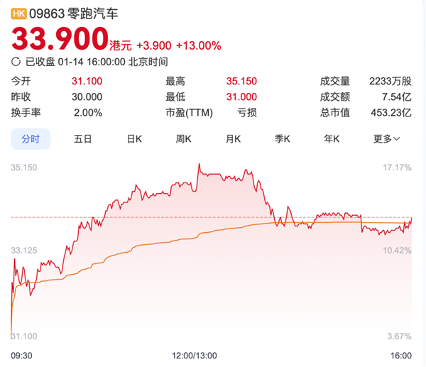 受这一消息提振,零跑股价暴涨13%,总市值达到453.23亿港元。