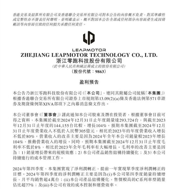 1月13日,零跑汽车发布盈利预告,宣布2024年第四季度实现净利润转正,提前一年达成单季度盈利目标。