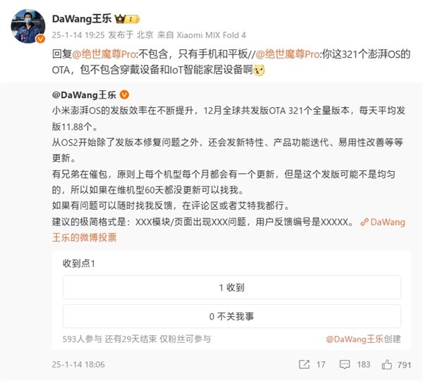此前小米手机系统软件部总监张国全也发文提过,在澎湃OS 2发布之前,他就在卢总面前立下了军令状——“坚决不做一锤子买卖”,要前置规划研发资源,快速响应用户反馈,持续改善体验。