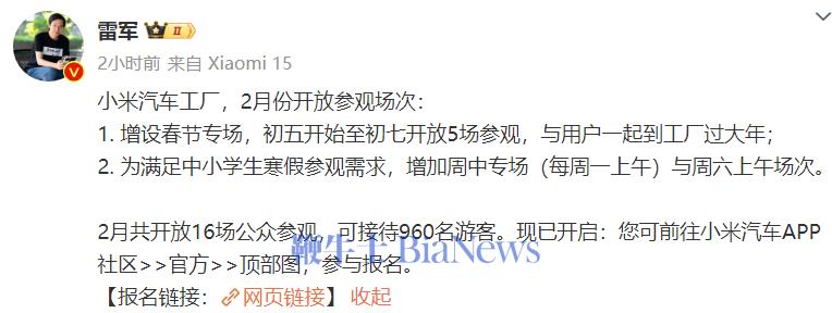 雷军称,2月共开放16场公众参观,可接待960名游客,现已开始报名。