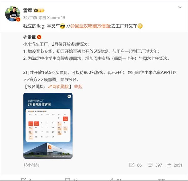 快科技1月15日消息,今天,小米创办人雷军发布小米汽车工厂2月份参观计划。在2月份,小米汽车工厂从初五至初七开放5场参观,与用户一起到工厂过大年。