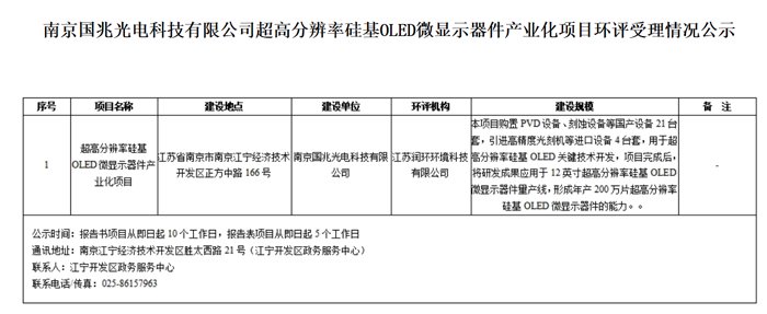 近日,南京市江宁区人民政府,公示了南京国兆光电科技有限公司超高分辨率硅基OLED微显示器件产业化项目环评受理情况。