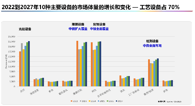 近年来,中微公司正在拓展薄膜设备、检测设备等制造品类,而薄膜设备是光刻机和刻蚀机外的第三大设备市场。该公司布局了薄膜设备中的MOCVD、LPCVD、ALD等设备,根据2024年业绩预告,MOCVD销售额约4亿元,同比下降18%,LPCVD在2024年实现首台销售,全年销售额约2亿元。此外,中微公司还在拓展第四大设备市场的检测设备。