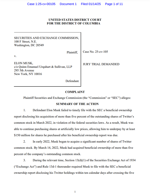 快科技1月15日消息,据媒体报道,当地时间1月14日,美国证券交易委员会在美华盛顿特区联邦法院对埃隆·马斯克提起诉讼,指控马斯克涉嫌证券违规。