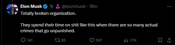 对于被美国证交会起诉一事,马斯克表示:“美国证交会完全是一个分崩离析的组织,他们把时间都花在这种事上,有那么多真正的犯罪行为却没有受到惩罚。”