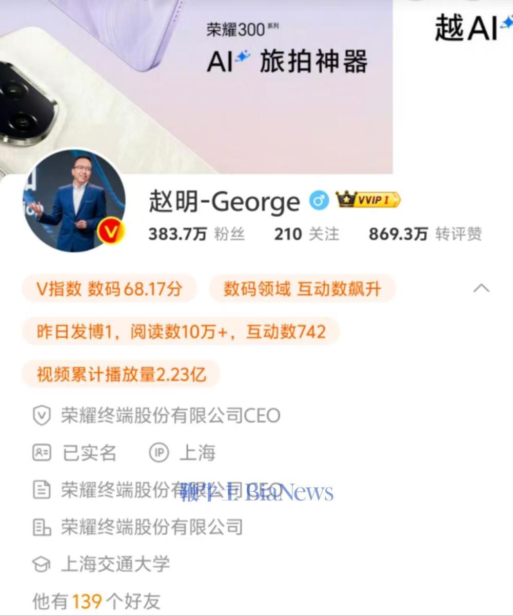 鞭牛士经查询,目前赵明微博主页仍显示“荣耀终端股份有限公司CEO”的身份。目前,荣耀官方尚未对赵明离职传闻作出回应。