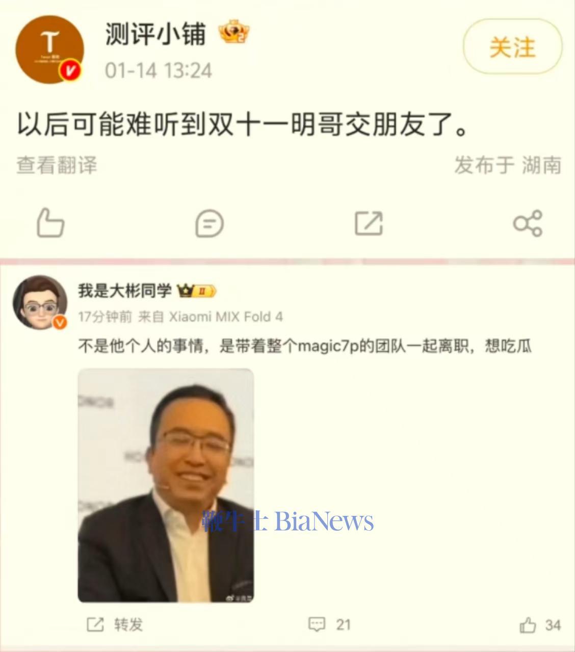鞭牛士 1月15日消息,昨日有数码博主称荣耀CEO赵明已离职,还有人称“赵明是带着整个magic7团队一起离职”。