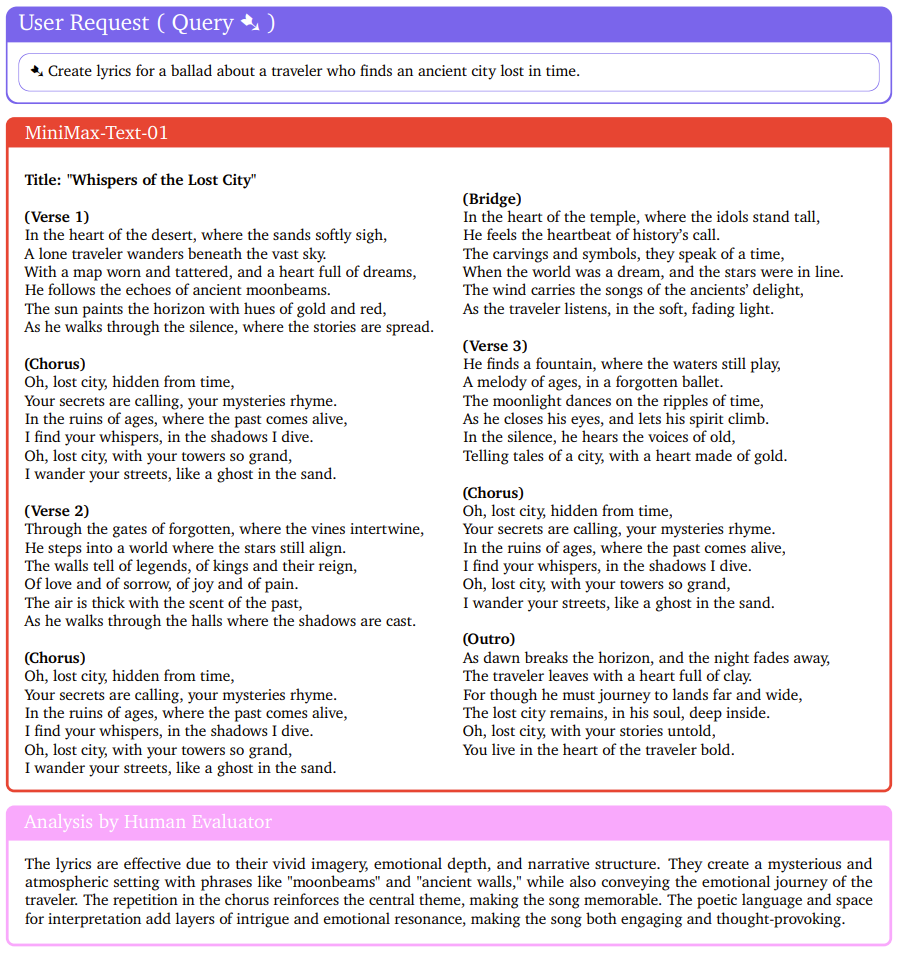 人类评估者也给出了非常正面的评价:诗意的语言和演绎空间为歌曲增添了层层的趣味和情感共鸣,使歌曲既引人入胜又发人深省。