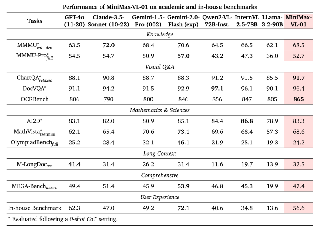 最终,得到的 MiniMax-VL-01 模型在各个基准上取得了如下表现。