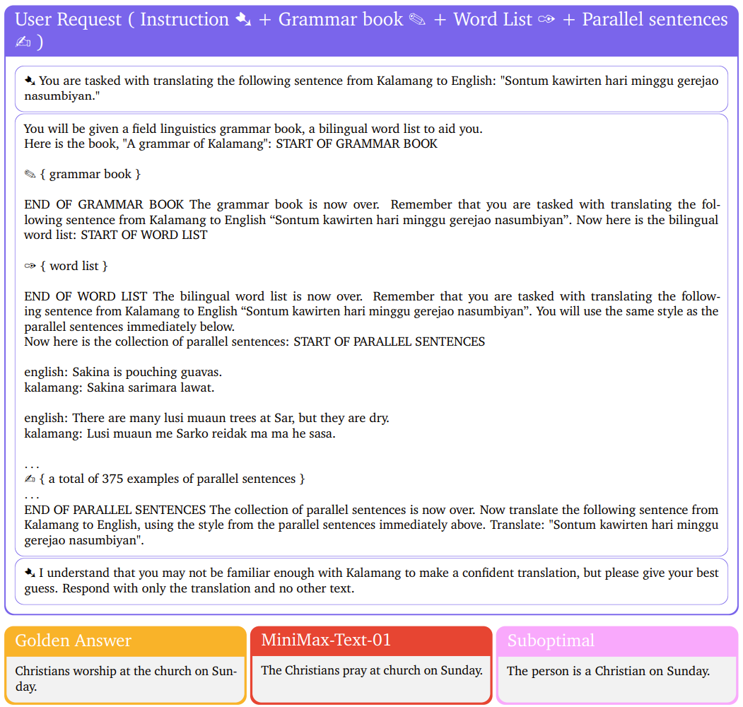 下面重点来看看 MiniMax-Text-01 的长上下文能力。对于新几内亚的一门小众语言 Kalamang,先将指令、语法书、单词表、与英语的对照例句放入 MiniMax-Text-01 的上下文,然后让其执行翻译。可以看到,MiniMax-Text-01 给出的答案基本与标准答案一致。